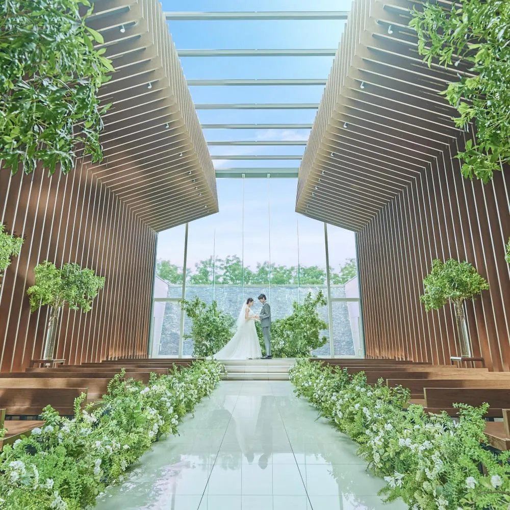 【大きく開かれた天窓から自然光が降り注ぐ”空と森のチャペル”】天窓・祭壇先の滝水のきらめきにより、光に包まれた空間に…全天候型の大階段やフラワーシャワーやチャペルでの映像演出など、フェアで体験しよう!